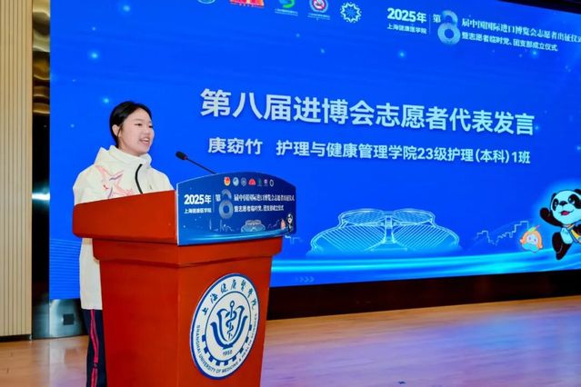 护理与健康管理学院23级护理(本科)1班庚窈竹作为志愿者代表发言,她分享了与进博会之间的故事:青春无悔,进博如约。表示将发挥青年团员先锋模范作用,带头坚定信念,凝聚青年力量,续写青春华章。