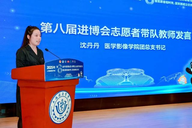 医学影像学院团总支书记沈丹丹作为带队教师代表发言。她承诺将切实履行带队职责,同时勉励志愿者们要珍惜此次实践机会,将专业知识与志愿服务相结合,在服务中学习、在奉献中成长,以阳光自信的形象、耐心细致的服务,展现上海健康医学院学子的良好风貌。