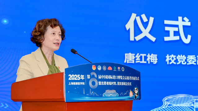 校党委副书记、副校长唐红梅代表学校向到场来宾致以热烈欢迎,并向长期支持学校进博会志愿服务的团市委、卫健委、健康促进中心,以及全体健康“小叶子”们表示衷心地感谢。她指出,健康“小叶子”们已连续多年投身进博舞台,尤其在爱国卫生与健康促进岗位上持续发力,以医学生专业素养在岗位上解答健康问询、普及卫生知识,成为进博会上的靓丽风景。部分“二、三年级”的同学更是续写与进博的缘分,充分彰显服务成效。临近开幕,唐书记希望同学们牢记“健康所系,性命相托”的初心,以青春之我,展现青春之上海,青春之健康,青春之中国,让世界看到中国青年向上向善的精神风貌。