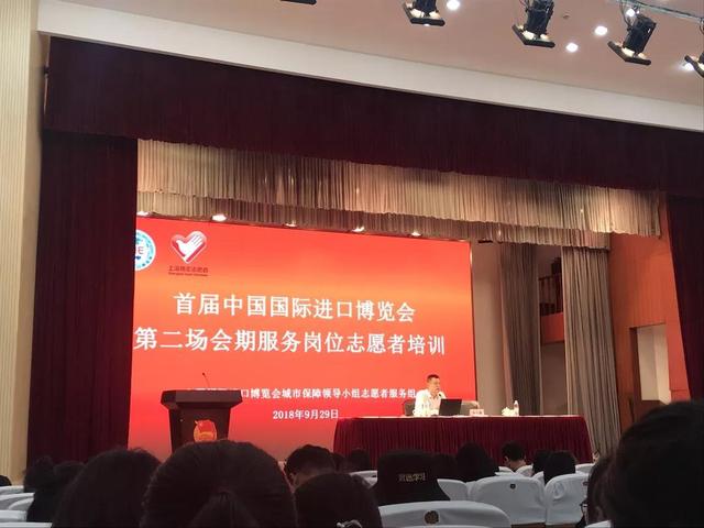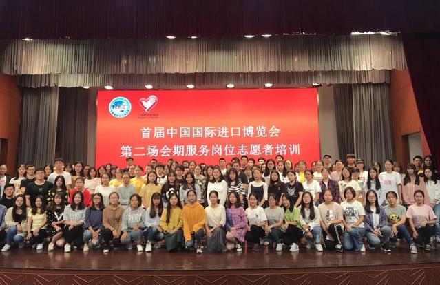 2018年9月29日,首届中国国际进口博览会会期服务岗位志愿者培训在上海市团校会青年堂举行,我校志愿者以饱满的热情参加了本次培训会。