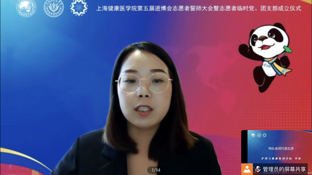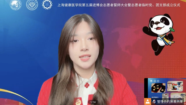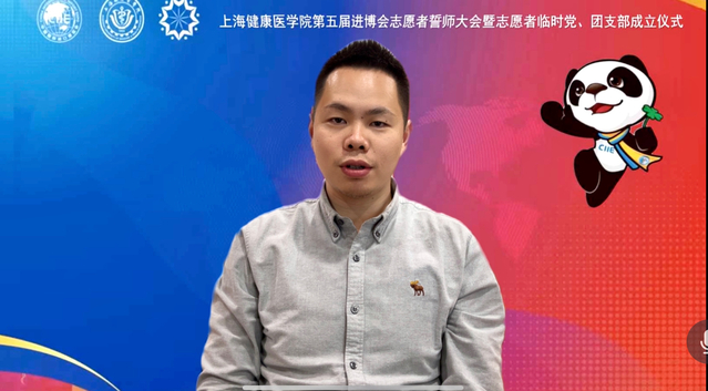 10月26日下午,上海健康医学院第五届中国国际进口博览会志愿者誓师大会暨志愿者临时党、团支部成立仪式在线上线下同步举行。上海健康医学院党委常委、宣传部部长李兆伟,校党委组织部副部长詹浩玲,团市委、市希望工程和青年志愿者指导中心合作联络部部长姚舜,护理与健康管理学院党总支副书记薛文正,校青年志愿者协会指导教师傅向东,校团委马志波,我校各部门,各学院相关负责人、学院团总支书记以及95名第五届进博会志愿者参与活动。校团委挂职干部林剑主持大会。