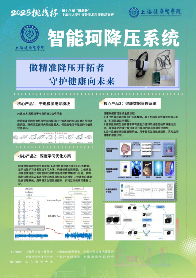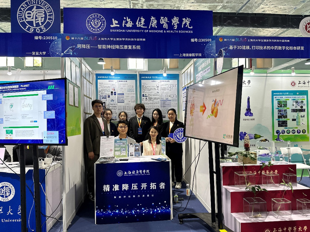 我校作为教育部产学合作协同育人项目获批高校,积极培养学生创新精神,引导广大健康学子投身学术科技实践活动,为创新赋能。校团委为积极备战第十八届上海市“挑战杯”课外学术作品竞赛,与教务处、创新创业学院、实践教学中心开展合作,选拔优秀作品参加本次竞赛,竞赛队伍数量稳中有进,参赛队伍质量不断突破。共组织112支队伍参加校赛,经专家评审选拔12支优秀队伍在市赛当中代表上海健康医学院出征。决赛采用现场展示、问辩和答辩的形式,我校入围的项目团队从现场布展到问辩、答辩环节都做了充分准备。经过激烈角逐,珂降压--智能神经降压康复系统项目团队在各环节中展现了卓越的实力,荣获上海市“二等奖”。