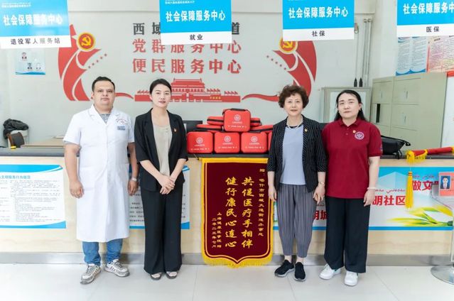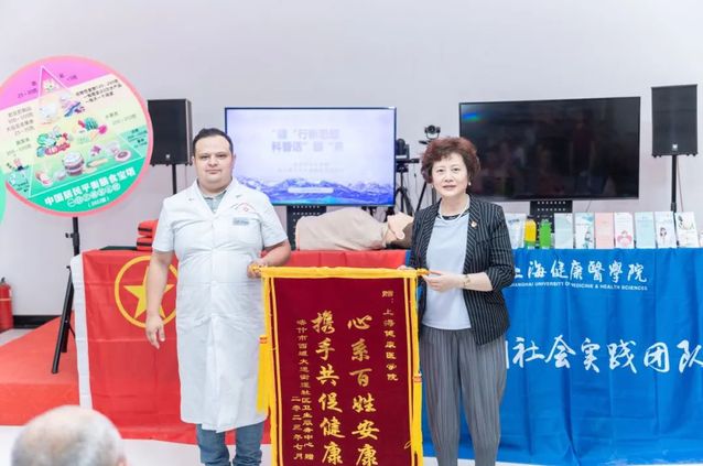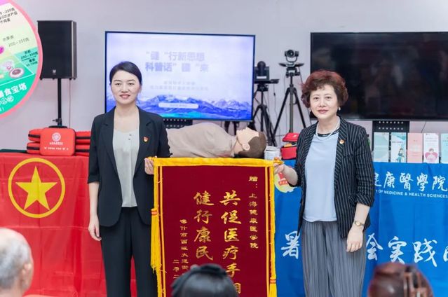 活动最后,校党委副书记、副校长唐红梅代表学校接受西域大道街道办事处、西域大道街道社区卫生服务中心赠与的锦旗,西域大道街道居民对团队高质量的科普服务和赠送的医疗急救包表示衷心的感谢。