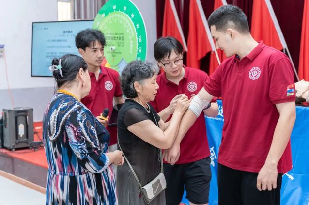 团队成员针对不同部位受伤情况,开展螺旋包扎、肘部“8”字包扎、头部帽式包扎等包扎技能“手把手”教学,并通过知识问答、互动的形式,加深所学急救知识,进一步提高了村民们外伤现场应急处理能力,减少不良后果的产生。村民们积极上台展示所学成果,反响热烈,充分展现了科普小讲堂的意义与价值。