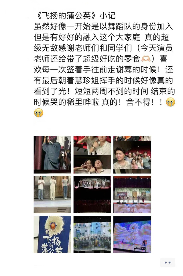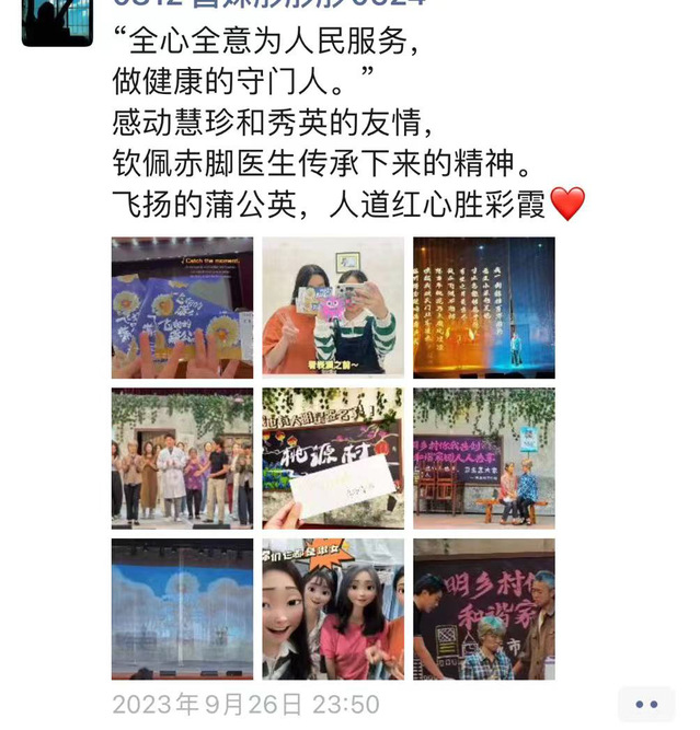 很感动在自己的十九岁里,有幸能够代入进李慧珍这个角色,虽然不能够真正地成为她,但通过话剧演出,将她的灵魂与精神短暂嫁接进自己身上的方式,真切共情到了她做一辈子赤脚医生的不易与成就。对我而言,对所有受过她救治的百姓而言,她无疑是永远明媚、向着朝阳前行的向日葵,也是生生不息、随处播种下希望的蒲公英。青山不改,绿水长流,容我向您做出最后的告别,再见了,李慧珍医生!