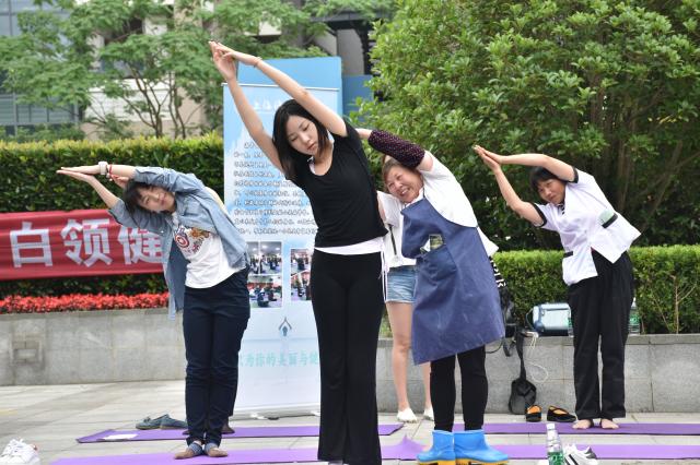 白领健身操:适当的运动有利于排解压力,近期较受欢迎的十分钟健身操由志愿者同学们亲身示范。