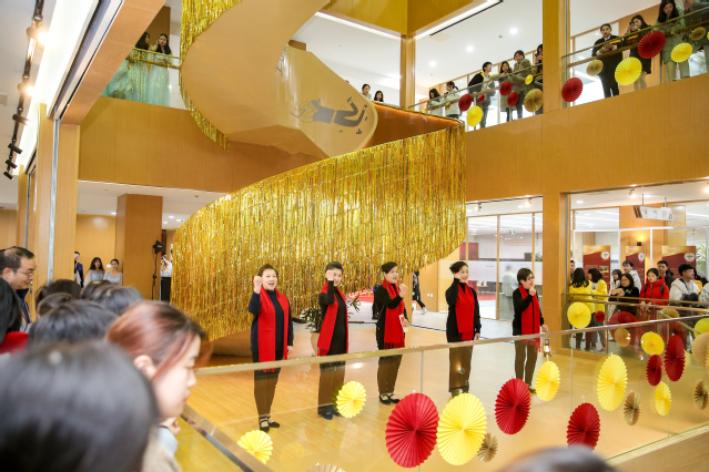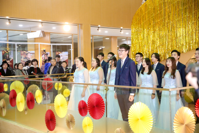 第二篇章开始前,在新南苑图书馆7楼,随着图书馆馆长彭骏的倒数计时,郑沈芳书记、黄钢校长、本年度图书借阅达人师生代表,同时按下电子按钮点亮启动球,在热烈掌声与欢呼声中,我校无纸化图书馆正式开馆。现场气氛达到高潮。随后黄钢校长致新年贺词,对一年来为学校的发展做出的艰苦卓绝贡献的师生们致以衷心的感谢和美好的祝愿!接下来的音乐会中,我校舞蹈团、云和民乐团、至善合唱团、室内乐团和退休教师等悉数登台,全场师生沉浸在唯美的旋律当中,使全场的气氛再次到达高潮。