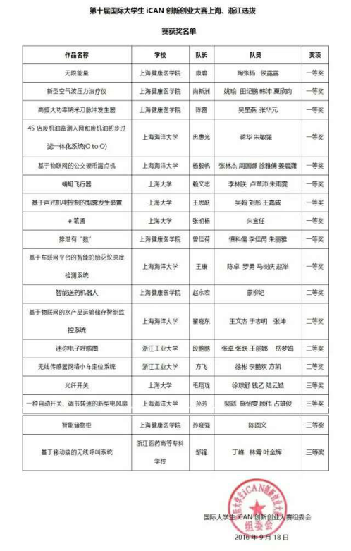 9月18日,国际大学生 iCAN 创新创业大赛组委会公布了第十届国际大学生iCAN创新创业大赛上海、浙江选拔赛中的获奖名单,我校推送的“无限能量”、“新型空气波压力治疗仪”、“高频大功率纳米刀脉冲发生器”、“排泄有‘数’”4个项目获得大赛一等奖,并将冲刺10月份的全国决赛。另外2个项目“智能送药机器人”和“智能储物柜”分别获得二等奖和三等奖的好成绩。