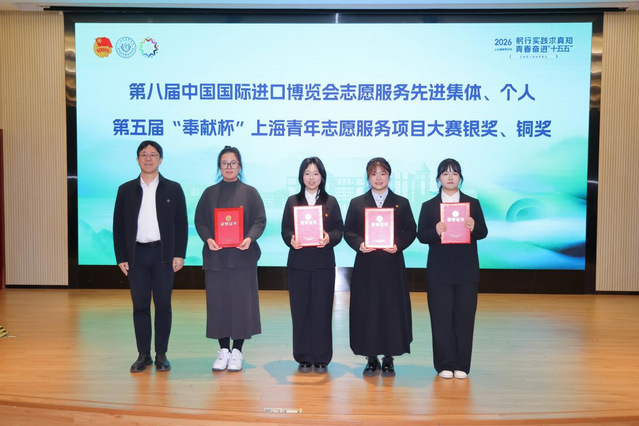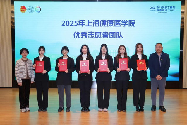 上海健康医学院党委副书记、副校长王庆华为2025年“知行杯”上海市大学生社会实践大赛优胜杯、第八届中国国际进口博览会志愿服务先进集体、个人,第五届“奉献杯”上海青年志愿服务项目大赛银奖、铜奖,等项目获奖集体代表颁奖。