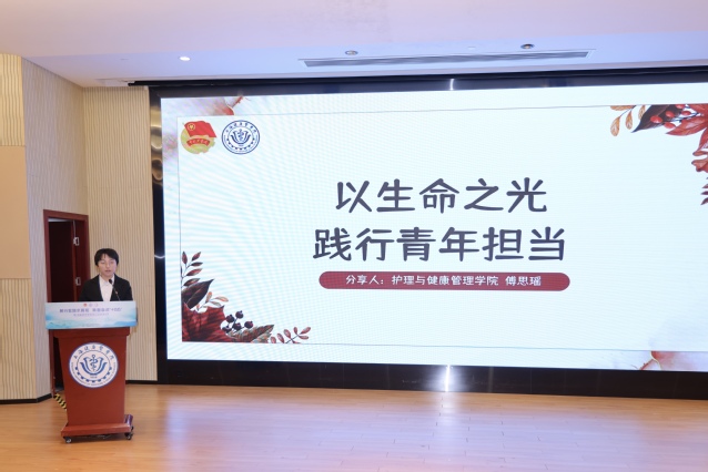 校优秀志愿者之星代表、护理与健康管理学院傅思瑶以《以生命之光,践行生命担当》为题,讲述了从白血病患者到志愿者先锋的蜕变之路。她不仅实现了生命的奇迹,更将这份来之不易的“重生”转化为回馈社会的强大动力。从重返医院担任抚慰病患的“瑶瑶老师”,到组建专业志愿服务队,再到三次为爱捐发,她用长达十一年的坚守,完成了一场从“受助者”到“施助者”的身份跨越。面向未来,她将带着这份被爱点亮的初心,在医学之路上深耕不辍,用行动证明:青春的价值,就在于与时代同频、与人民同心。