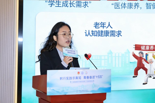 校团委(挂职)副书记李夏雯作《医体康养,智健银龄》项目分享。她以“三个第一次”为主线,讲述带领团队深入浦东、杨浦及五大新城多个社区,聚焦老年人认知健康需求,发挥康复、护理等专业优势,开展健康科普、跌倒风险评估、认知训练等实践探索。未来,她将强化“体医融合、体卫融合”等内容,让体育教学科研工作更贴合医学院的核心育人目标,将运动人体科学方向的科研做深做实,在“科研反哺实践、实践滋养科研”的良性循环中,让青春与智慧在服务人民健康的道路上交相辉映。