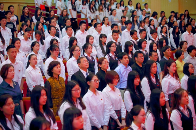 会前,同学们依次步入成人门,佩戴成人徽章,踏上成人成才之路。大会首先举行了隆重而又庄严的奏唱国歌仪式。接下来,由四名同学声情并茂地朗诵了《十八岁畅想曲》,抒发了卫校莘莘学子对纯真往昔的无限留恋,对未来的美好憧憬,将成长中对父母与师长的感恩之情展现的淋漓尽致。