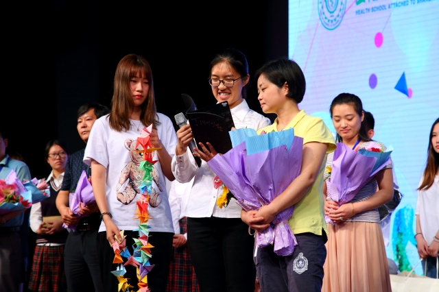 卫校学生何绪言家长上台发言,款款的演讲凝聚着家长们对同学们的殷切希望,将同学们的思绪带回了美好的童年,母爱载着孩子从童年、少年走向成熟,给予生命哺育成长。何绪言妈妈还代表全体家长,感谢学校对于孩子的悉心培养,她深切感受到孩子在这所学校的成长。接下来一组表现母子亲情的公益短片让台下的学生都潸然泪下,台上的母子相拥而泣,感恩的心、感谢有你,在场学生深深被感恩的氛围感染着。