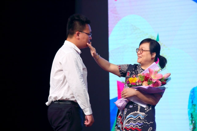 紧接着全体班主任上台,各班代表向班主任鲜花,并将精心准备的、装满同学们感激之情的礼物赠给了班主任,这无疑是全场最为激动人心的环节。6位班主任感动之情溢于言表,师生之情流露在心,轮到自己班级班主任讲话时,全班同学起立齐声给班主任送出祝福。班主任感动的心、颤抖的手,强忍着内心的激动和波澜,郁惠昌老师作为班主任代表上台发言,用自己的激情点燃了学生们内心的希冀。学生代表蒲佳颖同学进行了简单而又澎湃的发言,她发自内心的铮铮誓言抒发了全体同学们的共同心声和青春情怀。
